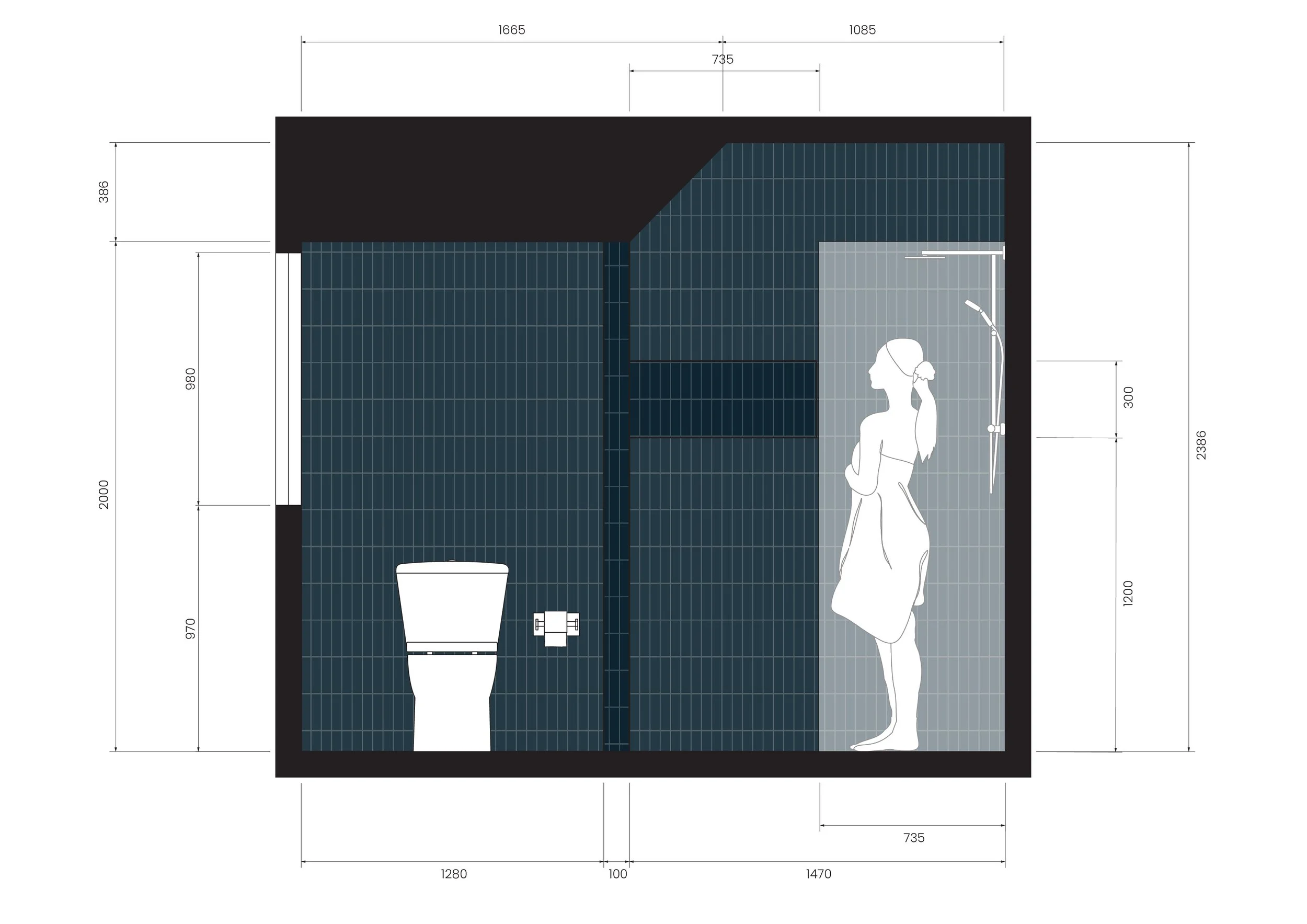 Reconfigured layout transforming one bathroom into a master and guest ensuite with efficient spatial planning. Elevation shows detailing tile layouts and material contrast across both bathrooms.